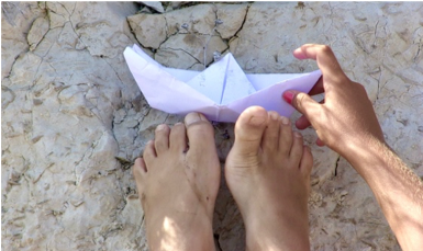 L’atelier s’est transformé aussi en création plastique d’objets à filmer. Tout d’abord, nous avons confectionné des origamis de bateaux où les enfants ont écrit à l’intérieur un poème commençant par « Je ré-enchante le monde avec… ». Puis ils ont peint de la couleur de leur choix des cannes à pêches à partir de roseaux que j’ai moissonné dans un champ, au bout desquelles nous avons accrochés nos petits bateaux en papiers. A partir de cette étape, nous étions prêts à vagabonder à travers l’île pour créer des images poétiques, des situations insolites avec nos cannes à pêches magiques et expérimenter cette notion de Land-art avec nos petits bateaux origami.